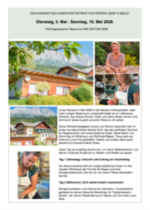 Unser nächster Workshop „DEIN ENERGETISCH KREATIVER RETREAT FÜR KÖRPER, GEIST & SEELE“  in der Steiermark findet vom 5.Mai 2026 (Dienstag) bis 10. Mai 2026 (Sonntag) statt.